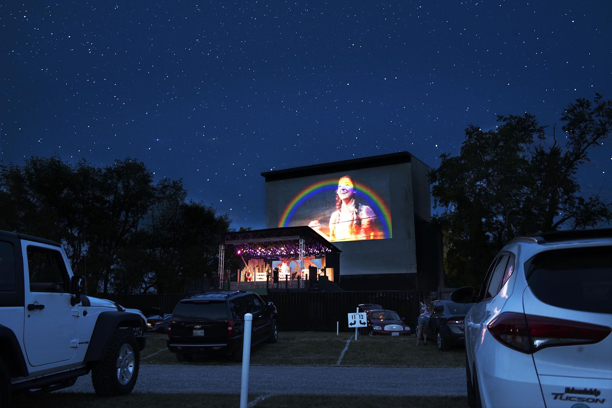 Soon tradesmen, volunteers and others joined in, their work supported by the generosity of donors and businesses who depend on the Barter to bring tourists to their small town of 8,200. A covered stage went up that is tall enough for cars in the back row to see, and cameras were brought in to project special effects and close-ups of the actors on the movie screen above. Sound was designed to be aired through the car radios of the audience. Actors lived in a quarantine bubble.