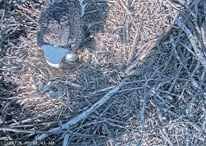We are saddened to announce that on Saturday both eggs were revealed to have collapsed. There was no sign of any real contents, so the presumption is that this season's eggs were never viable. You may see the remains of a shell on the rails of the nest.